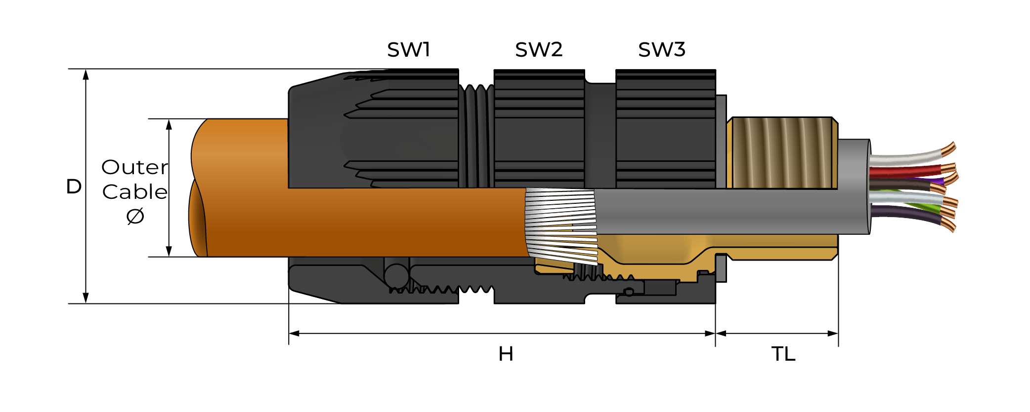 Материал корпуса, колпачок PA6 Внутренняя часть Латунь Уплотнение NBR Материал O-Ring NBR Степень IP IP68, IP66 Воспламеняемость V0 согласно UL94